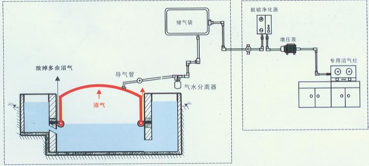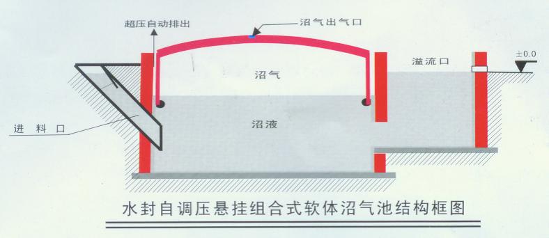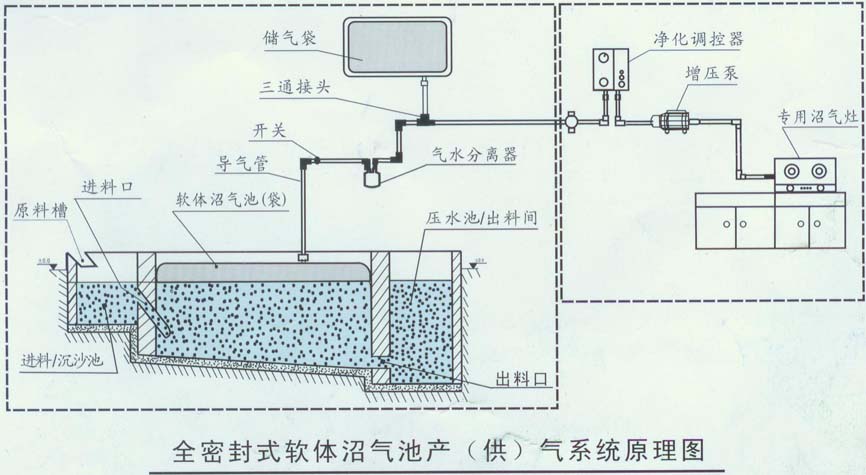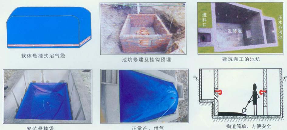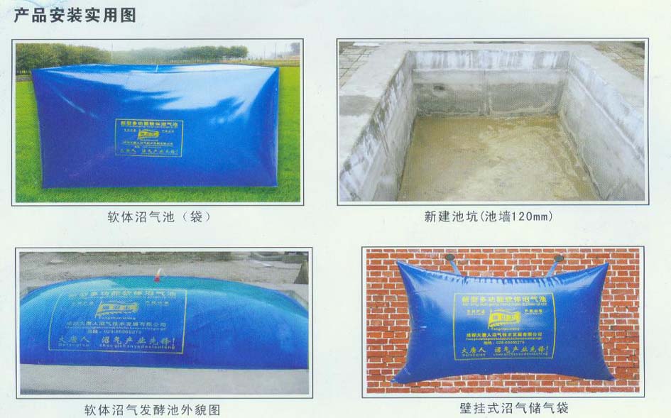 | 软体沼气(袋)在安装时,根据进、出口位置,需在现场剪切开孔,分别套入不同规格的法兰盘,法兰盘一端与池体内连接,另一端与硬塑料进料管、出料管及出气管粘合连接,由出气咀接通输气管道,再连接汽水分离器、储气袋、除硫净化调控器、增压泵、终端用气设备如炉具、沼气灯、热水器、取暖炉等形成完整的沼气产气和供气使用系统。 | ||||||||||||||||||||||||||||||||||||||||||